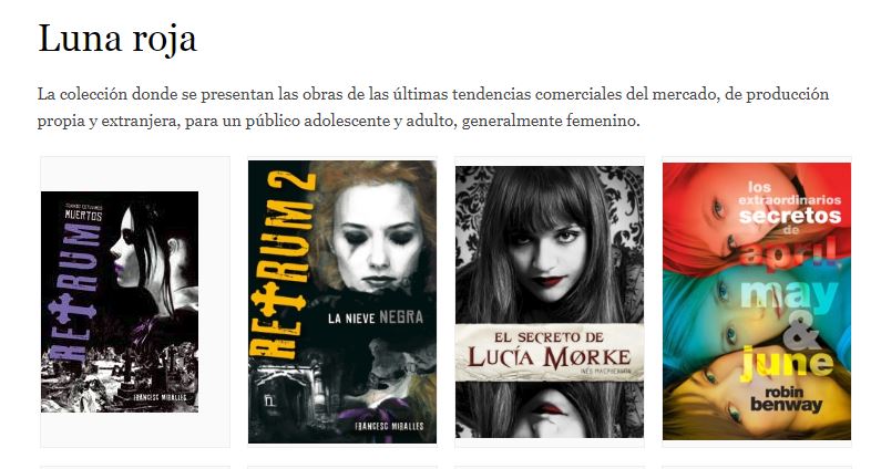 En la página de la colección Luna Roja de la editorial La Galera vemos una definición que concuerda con lo analizado anteriormente: últimas tendencias comerciales, para un público a partir de 14 años y preferentemente femenino.