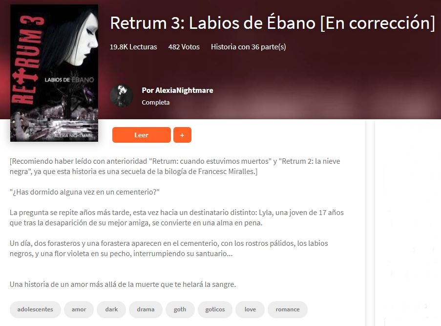 En el caso de Retrum encontramos a AlexiaNightmare que no solo ha tomado el nombre de la protagonista femenina, sino que ha escrito Retrum 3 en Wattpad. Tal y como comenta Alberto E. Martos García [7] al personalizar los gustos de los adolescentes, éstos se identifican con estos mundos de ficción con mucha intensidad y se convierten en fans de esos universos sea cual sea su formato (libro, película, música, etc.). Es en este punto donde los fans pueden escribir historias propias o releer textos que les parecen continuaciones de estas sagas.